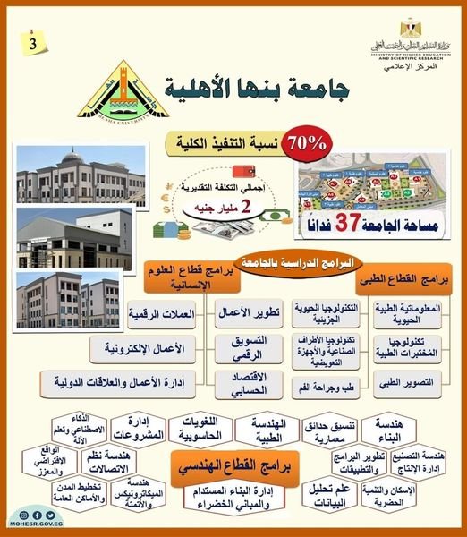 وصرح د. عادل عبدالغفار، المستشار الإعلامي والمتحدث الرسمي للوزارة، أن جامعة بنها الأهلية تقع على مساحة 37 فدانًا، وتشهد تقدم كبير في معدلات التنفيذ للإنشاءات الجارية بكافة مباني الجامعة والتي بلغت 70%، وبتكلفة بلغت قيمتها 2 مليار جنيه، كما تم الانتهاء من أعمال المباني الرئيسية، وجاري الانتهاء من التشطيبات الداخلية النهائية، والالتزام بمُعدلات الإنجاز للأعمال الإنشائية التي تسير وفقًا للجداول الزمنية المُحددة مُسبقًا.