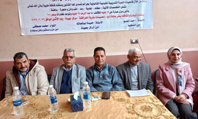 وتأتي المبادرة في إطار توعية قانونية وتوعية صحية شاملة، إلى جانب توفير قافلة طبية مجانية، بهدف التخفيف من الأعباء عن كاهل الأهالي بقرى مركز جهينة، ودعمهم صحيًا وقانونيًا، ورفع مستوى الوعي بالقضايا التي تمس حياتهم اليومية، وذلك في إطار الدور المجتمعي لحزب مستقبل وطن وخدمة المواطنين بالمناطق الأكثر احتياجًا.