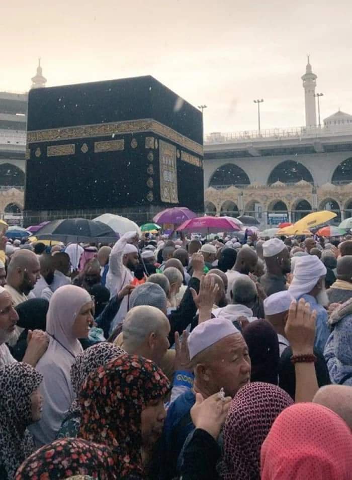 وتظهر لقطات الفيديو الأمطار الغزيرة وهي تتساقط فوق الحجاج فيما يمشون مرددين: “لبيك اللهم لبيك لبيك لا شريك لك لبيك”