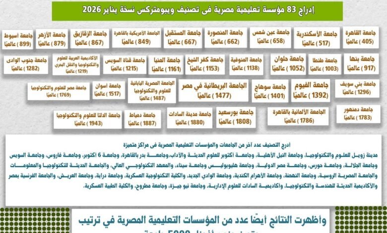 إدراج 83 مؤسسة تعليمية مصرية في تصنيف ويبومتركس العالمي نسخة يناير 2026م