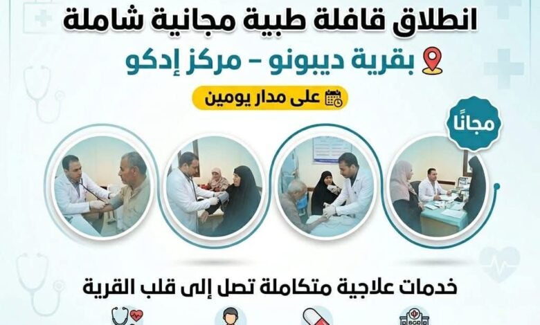 حيث تنظم مديرية الصحة بالبحيرة، بقيادة الدكتور/ إسلام عساف، قافلة طبية مجانية متعددة التخصصات بقرية ديبونو التابعة لمركز إدكو، وذلك على مدار يومي الجمعة والسبت الموافقين ١٧ و١٨ أبريل الجاري، لتقديم خدماتها لأهالي القرية والعزب والنجوع المجاورة.