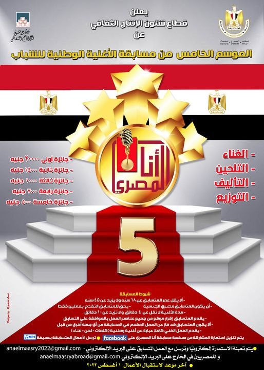 تحت رعاية الفنانة الدكتورة إيناس عبد الدايم وزيرة الثقافة، يعلن المخرج خالد جلال رئيس قطاع شئون الإنتاج الثقافي التابع لوزارة الثقافة، عن النسخة الخامسة لمسابقة " أنا المصرى" للأغنية الوطنية للشباب، بعد النجاح الكبير الذى حققته المسابقة فى دوراتها السابقة .