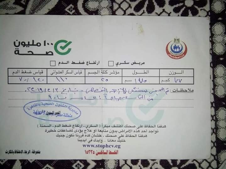 سيادة الرئيس اصدر تعليماتك لمديرى التأمين الصحي ووملاء الوزارة ان يستكملوا علاج مرضي فايرس سي واستكنال باقي التحليلات حتي وان كان للإطمئنان علي صحتهم بعد اصيبوا بالهلع والخوف من تلك المرض الذي اودي بحياة الكثير من المصريين