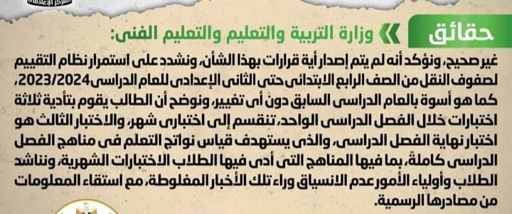 تداولت بعض المواقع الإلكترونية وصفحات التواصل الاجتماعي أنباء بشأن إصدار قرار بإلغاء نظام الاختبارات الشهرية لطلاب مرحلة النقل في المدارس خلال العام الدراسي 2023/2024، وقد قام المركز الإعلامي لمجلس الوزراء بالتواصل مع وزارة التربية والتعليم والتعليم الفني، والتي نفت تلك الأنباء، مُؤكدةً أنه لا صحة لإلغاء نظام الاختبارات الشهرية لطلاب مرحلة النقل في المدارس خلال العام الدراسي 2023/2024، وأنه لم يتم إصدار أية قرارات بهذا الشأن، مُشددةً على استمرار نظام التقييم لصفوف النقل من الصف الرابع الابتدائي حتى الثاني الإعدادي للعام الدراسي 2023/2024، كما هو أسوة بالعام الدراسي السابق دون أي تغيير، مُوضحة أن الطالب يقوم بتأدية ثلاثة اختبارات خلال الفصل الدراسي الواحد، تنقسم إلى اختباري شهر، والاختبار الثالث هو اختبار نهاية الفصل الدراسي، والذي يستهدف قياس نواتج التعلم في مناهج الفصل الدراسي كاملةً، بما فيها المناهج التي أدى فيها الطلاب الاختبارات الشهرية، مُناشدةً الطلاب وأولياء الأمور عدم الانسياق وراء تلك الأخبار المغلوطة، مع استقاء المعلومات من مصادرها الرسمية