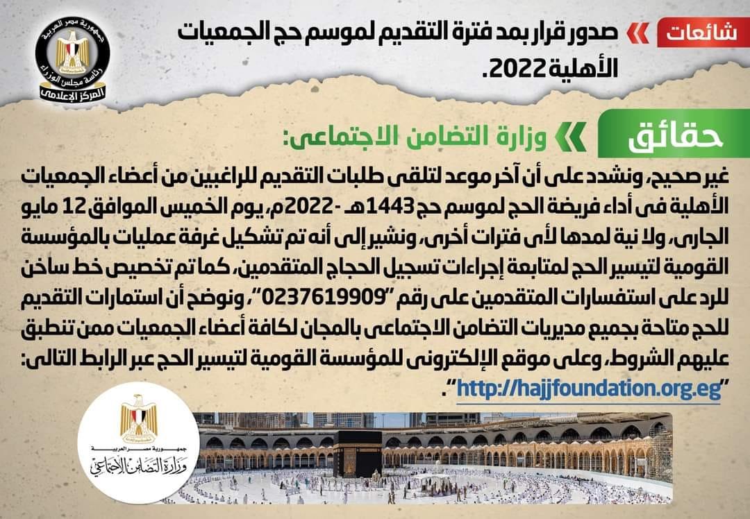 انتشر في بعض المواقع الإلكترونية وصفحات التواصل الاجتماعي أنباء بشأن صدور قرار بمد فترة التقديم لموسم حج الجمعيات الأهلية 2022، وقد قام المركز الإعلامي لمجلس الوزراء بالتواصل مع وزارة التضامن الاجتماعي، والتي نفت تلك الأنباء، مُؤكدةً أنه لا صحة لصدور قرار بمد فترة التقديم لموسم حج الجمعيات الأهلية 2022، مُشددةً على أن آخر موعد لتلقي طلبات التقديم للراغبين من أعضاء الجمعيات الأهلية في أداء فريضة الحج لموسم حج 1443هـ -2022م، يوم الخميس الموافق ١٢ مايو الجاري، ولا نية لمدها لأي فترات أخرى، مُشيرةً إلى أنه تم تشكيل غرفة عمليات بالمؤسسة القومية لتيسير الحج لمتابعة إجراءات تسجيل الحجاج المتقدمين، كما تم تخصيص خط ساخن للرد على استفسارات المتقدمين على رقم "0237619909"، مُشيرةً إلى أن استمارات التقديم للحج متاحة بجميع مديريات التضامن الاجتماعي بالمجان لكافة أعضاء الجمعيات ممن تنطبق عليهم الشروط، وعلى موقع الإلكتروني للمؤسسة القومية لتيسير الحج عبر الرابط التالي: "http://hajjfoundation.org.eg".