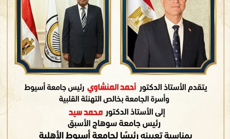 تقدم الأستاذ الدكتور أحمد المنشاوي، رئيس جامعة أسيوط، بخالص التهنئة القلبية إلى الأستاذ الدكتور محمد سيد، رئيس جامعة سوهاج الأسبق، بمناسبة تعيينه رئيسًا لجامعة أسيوط الأهلية لمدة أربع سنوات، عقب موافقة معالي وزير التعليم العالي والبحث العلمي، متمنيًا لسيادته التوفيق والسداد في أداء مهام منصبه.