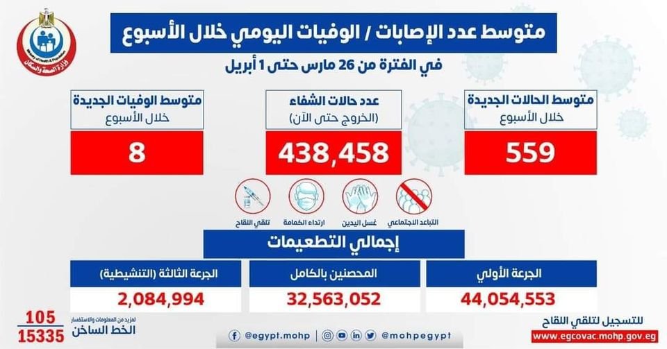 يذكر أن عدد الحاصلين على اللقاحات المضادة لفيروس كورونا حتى الآن، بلغ 32 مليونًا و 563 ألفًا و 52 من المحصنين بالكامل بجرعتي اللقاح.