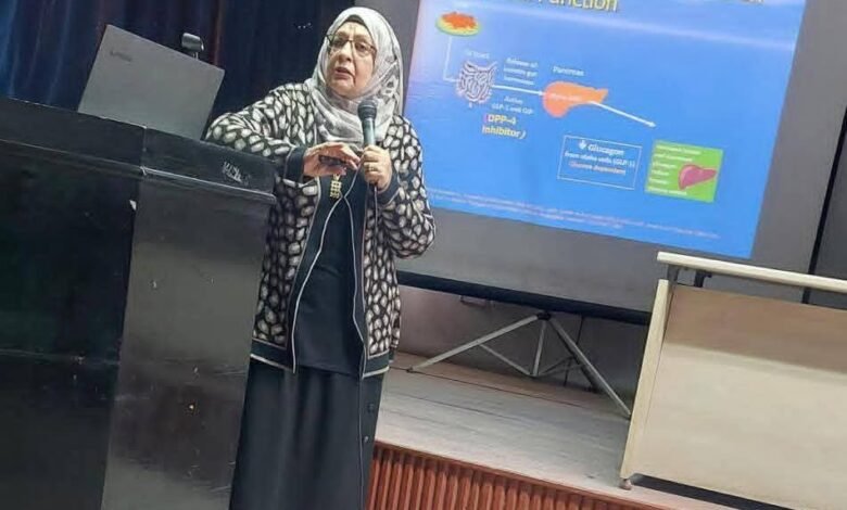 شهد اليوم العلمي حضوراً متميزاً من أطباء التدريب دفعة (٦١)، حيث حاضرت فيه الأستاذة الدكتورة لبنى التوني، أستاذ الأمراض الباطنة والغدد الصماء والسكر، والتي استعرضت بأسلوب تفاعلي أحدث البروتوكولات العلاجية لمرض السكري، وركزت المحاضرة على عدة محاور أساسية، منها، التعرف المبكر على مسببات داء السكري وأنواعه، وكيفية التعامل السريع والدقيق مع المضاعفات الحادة والمزمنة، إلى جانب الإشارة إلى أفضل الممارسات الإكلينيكية التي يجب أن يتقنها طبيب الامتياز أثناء فترة التدريب بالمستشفى.