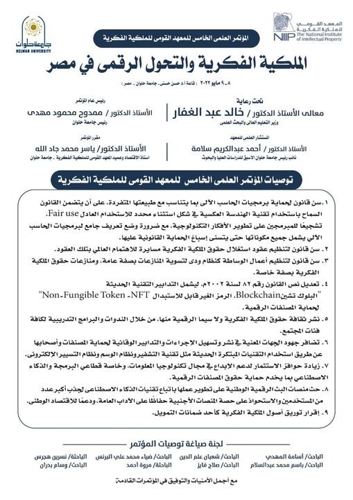 أعلن المعهد القومي للملكية الفكرية بجامعة حلوان عن توصيات المؤتمر العلمي الخامس عن "الملكية الفكرية والتحول الرقمي في مصر" والذي عقد تحت رعاية الأستاذ الدكتور خالد عبد الغفار وزير التعليم العالي والبحث العلمي والاستاذ الدكتور ممدوح مهدي القائم بعمل رئيس الجامعة والأستاذ الدكتور ياسر جادالله عميد المعهد القومي للملكية الفكرية، والاستاذ الدكتور احمد عبد الكريم سلامة نائب رئيس جامعة حلوان الأسبق لشئون الدراسات العليا والبحوث والمستشار العلمي للمعهد.