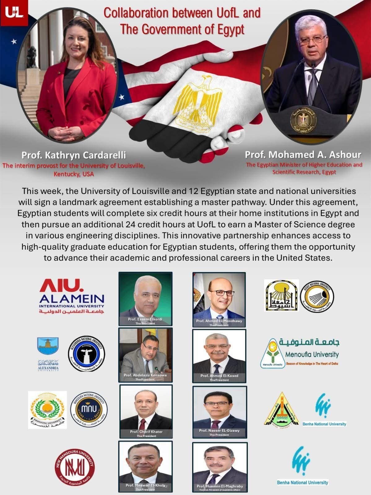 وتأتي هذه الاتفاقية ضمن جهود تعزيز فرص الطلاب المصريين في الحصول على تعليم عالٍ متميز على المستوى الدولي، حيث ينص البرنامج على أن يستكمل الطالب المصري 6 ساعات معتمدة في جامعته داخل مصر، ثم ينتقل إلى جامعة لويفيل لاستكمال 24 ساعة معتمدة إضافية، ليحصل على درجة الماجستير في عدد من التخصصات الهندسية الحيوية.