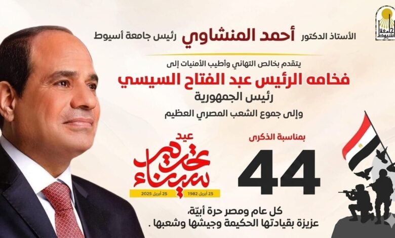 وأكد رئيس جامعة أسيوط أن ذكرى تحرير سيناء ستظل رمزًا للفخر والاعتزاز، ودليلًا على قوة الإرادة المصرية وقدرتها على استعادة الحقوق وصون مقدرات الوطن، مشيرًا إلى أن هذا النصر العظيم جاء تتويجًا لتضحيات أبطال القوات المسلحة الذين قدموا أرواحهم فداءً للوطن.