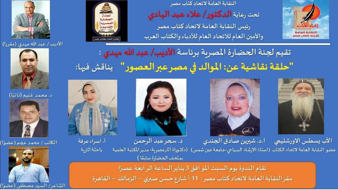 تحت رعاية الاستاذ الدكتور علاء عبدالهادى رئيس النقابة العامة لاتحاد كتاب مصر والامين العام للاتحاد العام للكتاب والادباء العرب تقيم لجنة الحضارة المصرية القديمة بالنقابة حلقة نقاشية تحت عنوان الموالد في مصر عبر العصور احتفالا بقدوم عيد الميلاد المجيد وذلك يوم السبت الموافق ٣ من يناير ٢٠٢٦ م في تمام الساعة الرابعة عصرا بمقر النقابة ويشارك في هذا المحفل الفكرى نخبة من المتخصصين تضم الاستاذة الدكتورة شرين صادق الجندى استاذ الارشاد السياحى بجامعة عين شمس والدكتورة سحر عبدالرحمن دكتوراة اثار مصرية ومدير المكتبة العلمية بالمتحف القومى للحضارة سابقا والاب يسطس الاورشليمى عضو اتحاد كتاب مصر والاستاذ الدكتور محمد غنيم وكيل كلية الفنون الجميلة بجامعة المنيا ويدير الحلقة الكاتب والباحث عبدالله مهدى رئيس لجنة الحضارة المصرية القديمة وتأتى هذه الندوة لتاكيد التواصل الحضارى المصرى حيث اوضح الباحث عبدالله مهدى ان الثقافة الشعبية المصرية هي البوتقة التى انصهرت فيها الحضارات القديمة والقبطية والاسلامية وهو ما يظهر جليا في احتفال الشعب بالمولد كطريقة لتكريم الشخصيات العظيمة واشار مهدى الى ان الموالد ظاهرة تاريخية بدأت منذ عيد الاوبت في مصر القديمة وصولا الى مولد ابو الحجاج الاقصرى وموالد القديسين والولياء مؤكدا ان هذه الاحتفالات صمدت عبر الزمن لانها تخلق حالة من التآزر الاجتماعى والتسامح كما تمثل مواسم اقتصادية وتجارية كبرى تساهم في تنشيط الحركة التجارية والصناعية بجانب كونها متنفسا للترويح عن النفس عبر الفنون الشعبية مثل خيال الظل والالعاب والملاهى وشدد المشاركون على ان مصر ستظل ارض السلام والمحبة والامان التى احتضنت العائلة المقدسة وباركتها وستبقى الموالد جزءا اصيلا من الهوية المصرية التى تجمع بين الروحانيات والبهجة الشعبية