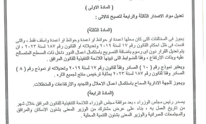 وتتضمن أبرز التعديلات المقترحة اعتبار استكمال الأعمال حتى مرحلة صب السقف في بعض الحالات بمثابة ترخيص منتج لكافة آثاره بما يفتح الباب أمام تسوية أوضاع قائمة بصورة قانونية