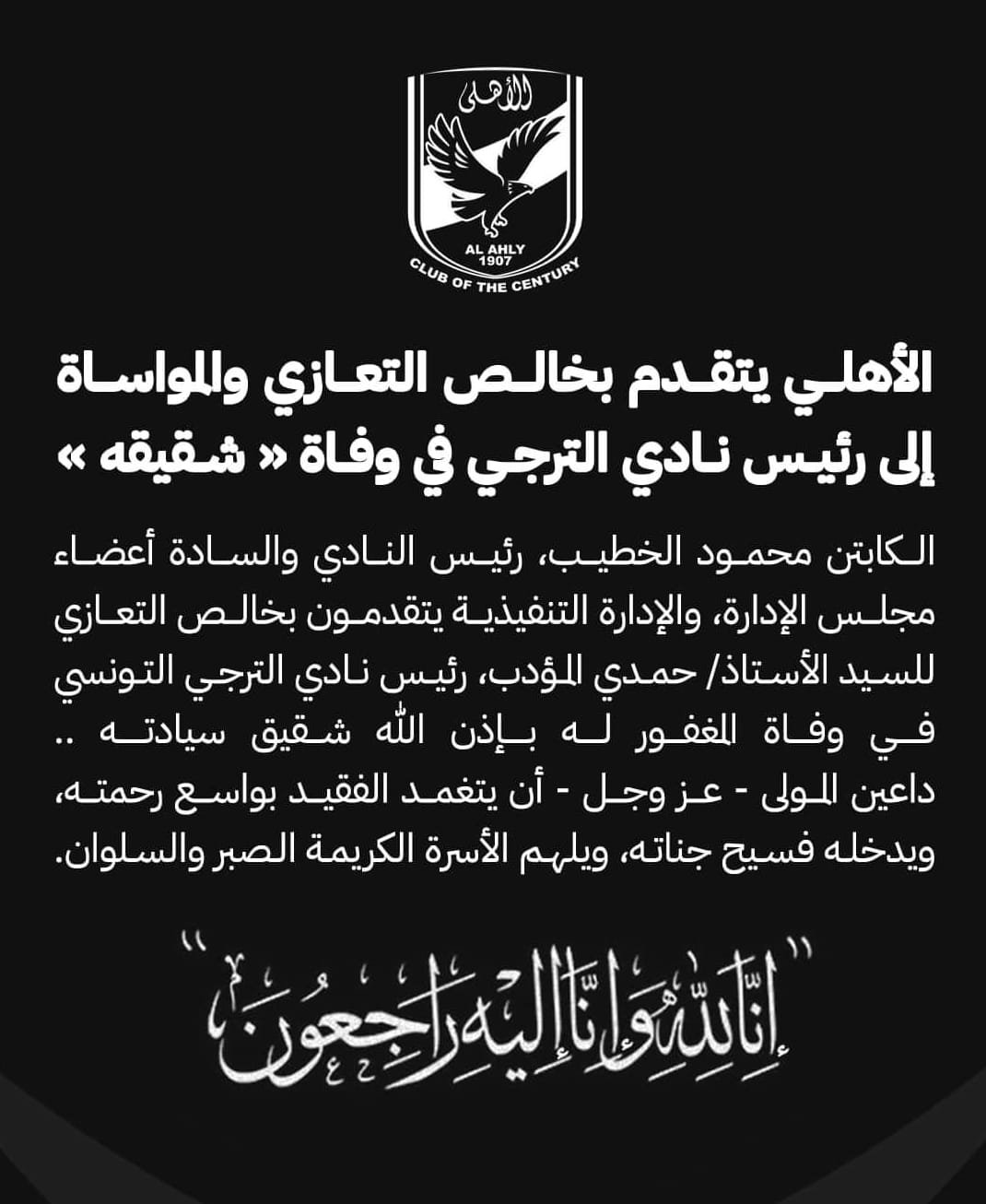 " يتقدم الكابتن محمود الخطيب، رئيس النادي الأهلي، والسادة أعضاء مجلس الإدارة، والإدارة التنفيذية، بخالص التعازي للسيد الأستاذ/ حمدي المؤدب، رئيس نادي الترجي التونسي، في وفاة المغفور له بإذن الله شقيقه" .