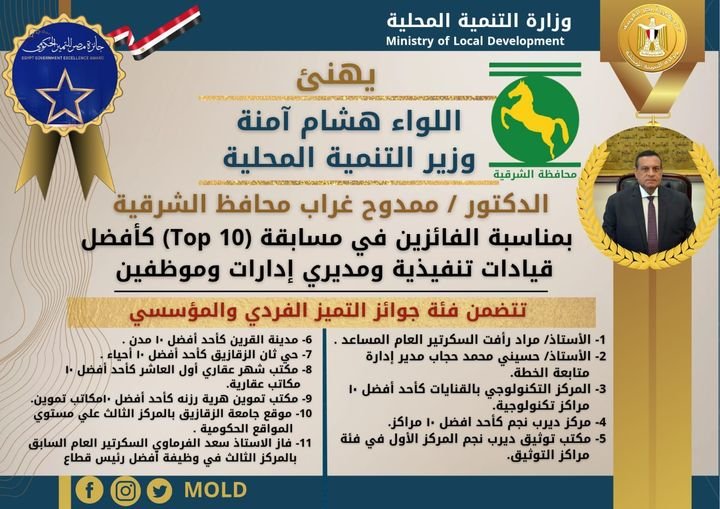 قدم وزير التنمية المحلية التهنئة للفائزين في مسابقة (Top 10 ) كأفضل قيادات تنفيذية ومديري إدارات وموظفين ( فئة جوائز التميز الفردي والمؤسسي) وهم :-
