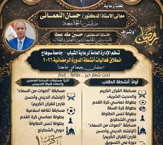 تحت شعار “خير طاقة.. إنجاز” تنطلق فعاليات أنشطة الدورة الرمضانية بجامعةسوهاج، والتي تنظمها إدارة رعاية الشباب المركزية للطلاب من مختلف كليات الجامعة، وذلك في إطار حرص إدارة الجامعة على دعم الأنشطة الطلابية وتعزيز روح المنافسة الإيجابية بين الطلاب.