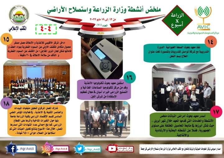 أصدر مركز المعلومات الصوتية والمرئية التابع لوزارة الزراعة واستصلاح الاراضي "الانفوجراف الاسبوعي" في نسخته رقم ٩١ ، حول الحصاد الاسبوعي لأهم أنشطة الوزارة، خلال الاسبوع الماضي في الفترة من ١٣ الى ١٩ مايو الجاري، وذلك بالتعاون مع المكتب الاعلامي للوزارة، كما أصدر المركز ايضا ملخصا بالفيديو، حول انشطة الوزارة خلال نفس الفترة.
