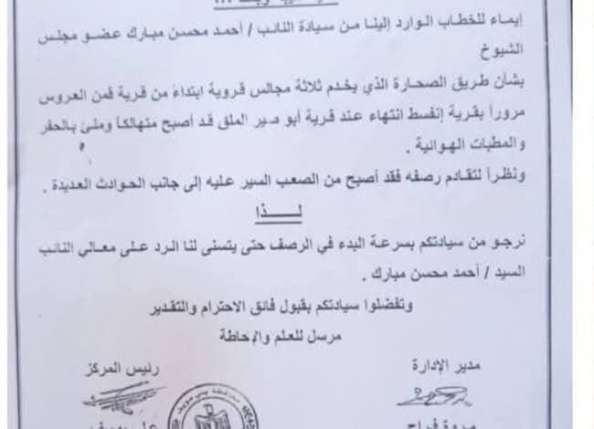ومن جانبه، أعرب النائب أحمد محسن مبارك عن خالص شكره وتقديره للواء عبد الله عبد العزيز محافظ بني سويف، ولرئيس جهاز التعمير بشمال الصعيد، ومدير عام الطرق، وكذلك للأستاذ علي يوسف رئيس مجلس ومدينة الواسطى، تقديرًا لدعمهم المتواصل وحرصهم على تلبية احتياجات المواطنين والاستجابة لمطالبهم.