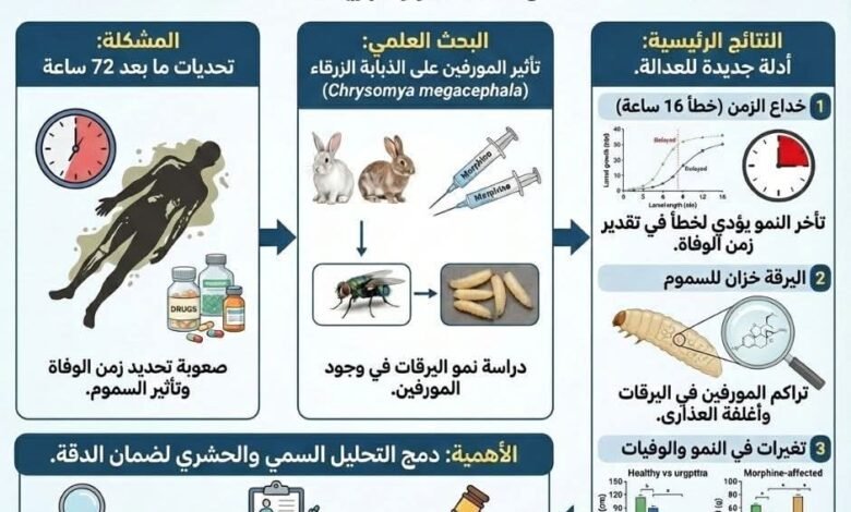 وانطلقت الدراسة من تساؤل علمي بالغ الدقة: هل يمكن ليرقة صغيرة أن تغيّر مسار جريمة قتل؟ وقد أكدت النتائج أن الإجابة نعم، لا سيما في الحالات التي تمر فيها أكثر من 72 ساعة على الوفاة، حيث تتلاشى الأدلة التقليدية، وتبرز الحشرات كأدق وسيلة علمية لتقدير زمن الوفاة. غير أن التحدي الأكبر يظهر عندما يكون المتوفى قد تعاطى مواد مخدرة أو عقاقير تؤثر في نمو هذه الحشرات، وهو ما تصدى له الفريق البحثي من خلال دراسة تأثير “المورفين” – أحد أشهر المسكنات الأفيونية – على نمو يرقات الذبابة الزرقاء (Chrysomya megacephala)، التي تُعد من أهم الأنواع المستخدمة في التحقيقات الجنائية .