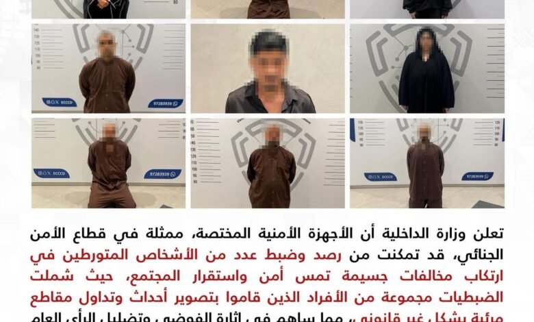 البيان كشف أن قطاع الأمن الجنائي تمكن من رصد وضبط عدد من المتورطين في مخالفات جسيمة تمس أمن واستقرار المجتمع من بينها تصوير أحداث ميدانية وتداول مقاطع مرئية بصورة غير قانونية وهو ما اعتبرته الوزارة سلوكا يساهم في إثارة الفوضى وتضليل الرأي العام وبث الخوف بين المواطنين والمقيمين