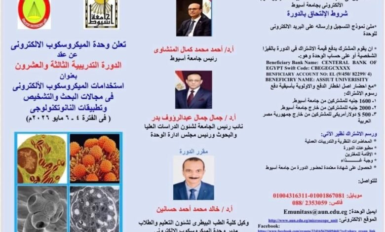 تعلن وحدة الميكروسكوب الإلكتروني بجامعة أسيوط عن تنظيم الدورة التدريبية الثالثة والعشرين تحت عنوان: “استخدامات الميكروسكوب الإلكتروني في مجالات البحث والتشخيص وتطبيقات النانوتكنولوجي”، وذلك خلال الفترة من 4 إلى 6 مايو 2026.