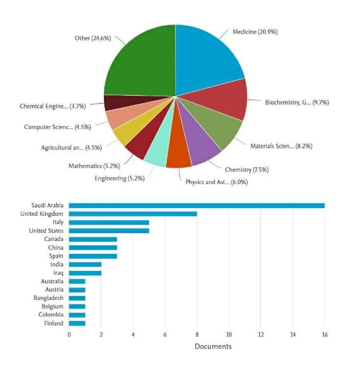 أن النشر الدولى كان جيدًا (64 بحث) وكان توزيع التخصصات كالتالي في مجال العلوم الأساسية (29.2%) وشملت كلا من الكيمياء الحيوية والوراثة والبيولوجيا الجزيئية (9.7%)، الكيمياء (7.5%)، الفيزياء والفلك (6%)، الرياضيات (5.2%)، علوم الحاسب (4.5%)، علوم البيئة (4.2%)، يلي العلوم الأساسية العلوم الطبية (20.9%)، ثم علوم المواد (8.2%)، فالصيدلانيات وعلوم السموم (5.8%)، فالهندسة (5.2%)، والزراعة والعلوم البيولوجية (4.5%)، والهندسة الكيميائية (3.7%).