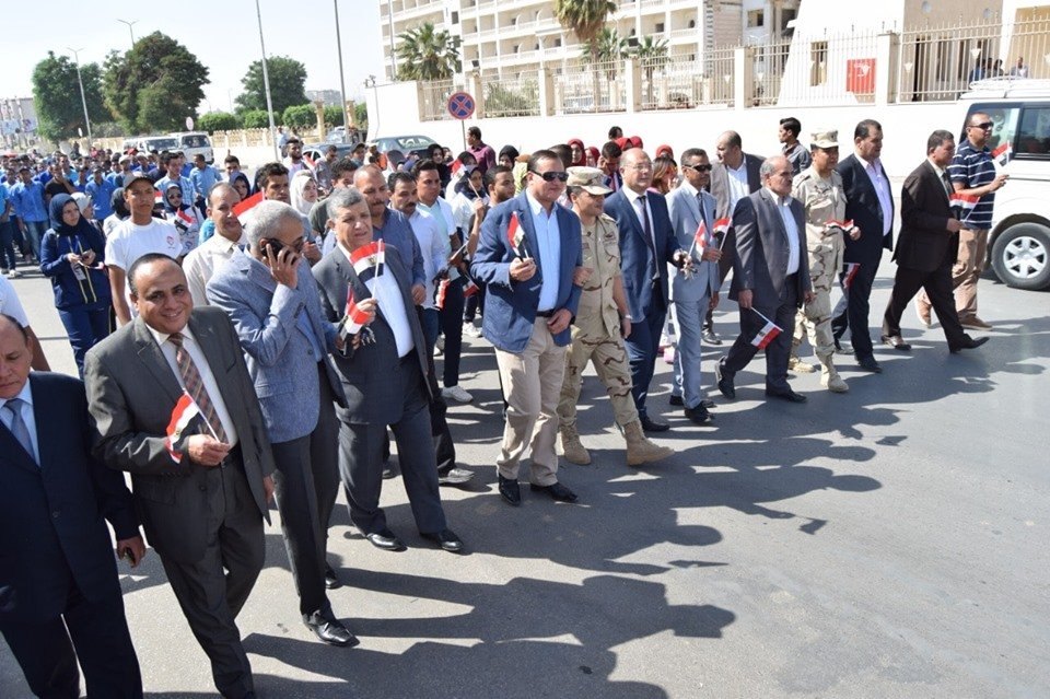 وقال رئيس الجامعة أنه بمشاركة طلاب من أجل مصر تم تنظيم مسيرة حاشدة بدأت من مبني مديرية الامن الي الجامعة، تزينها الأعلام والأغاني الوطنية الحماسية، وذلك حرصاً على إلهام الشباب بروح وحماس وعزيمة وإرادة المصريين والجيش المصري، التي ضرب بها المثل ليس فقط على الصعيد الاقليمي ولكن على الصعيد العالمى، لتخريج شباب قادر على مواجهة التحديات المعاصرة ودحض المؤامرات والتصدى لحروب الجيل الرابع.