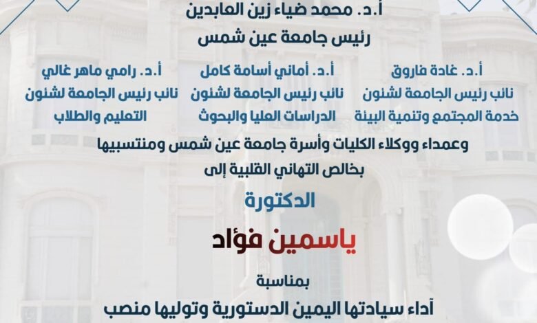 يتقدم ا.د محمد ضياء زين العابدين رئيس جامعة عين شمس، والسادة نواب رئيس الجامعة، وعمداء الكليات، بخالص تهانيهم القلبية بصدور قرار تعيين الدكتورة ياسمين فؤاد في منصب أممي رفيع المستوى، كوكيلة للأمين العام للأمم المتحدة والأمينة التنفيذية لاتفاقية الأمم المتحدة لمكافحة التصحر (UNCCD) .