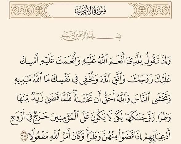 ​وفي هذه اللحظة الفارقة، نزل قول الله تعالى: ﴿وَإِذْ تَقُولُ لِلَّذِي أَنْعَمَ اللَّهُ عَلَيْهِ وَأَنْعَمْتَ عَلَيْهِ أَمْسِكْ عَلَيْكَ زَوْجَكَ وَاتَّقِ اللَّهَ وَتُخْفِي فِي نَفْسِكَ مَا اللَّهُ مُبْدِيهِ وَتَخْشَى النَّاسَ وَاللَّهُ أَحَقُّ أَن تَخْشَاهُ ۖ فَلَمَّا قَضَىٰ زَيْدٌ مِّنْهَا وَطَرًا زَوَّجْنَاكَهَا لِكَيْ لَا يَكُونَ عَلَى الْمُؤْمِنِينَ حَرَجٌ فِي أَزْوَاجِ أَدْعِيَائِهِمْ إِذَا قَضَوْا مِنْهُنَّ وَطَرًا ۚ وَكانَ أَمْرُ اللَّهِ مَفْعُولًا﴾.
