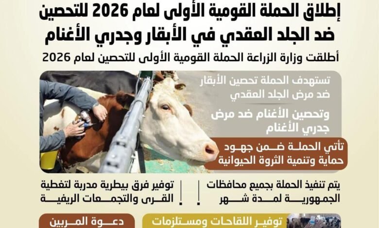 في توقيت بالغ الأهمية أطلقت وزارة الزراعة واستصلاح الأراضي الحملة القومية الأولى لعام 2026 لتحصين الأبقار ضد الجلد العقدي والأغنام ضد الجدري في تحرك يعكس توجهًا واضحًا نحو تعزيز الأمن الحيوي وحماية أحد أهم ركائز الاقتصاد الزراعي في مصر