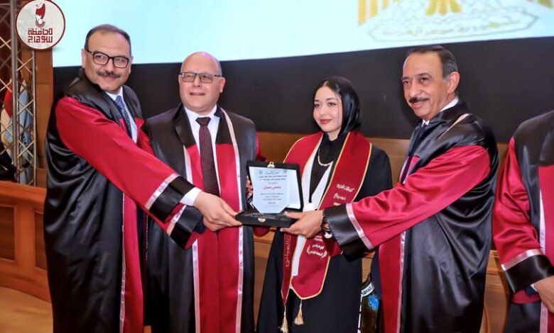 وقام ” راشد ” ورئيس جامعة سوهاج بتكريم طلاب الدفعة ومنحهم شهادات التقدير، مقدما لهم التهنئة على تفوقهم، كما تم تكريم أسرتي طالبين متوفين من المتفوقين، وتسلم السيد المحافظ من رئيس الجامعة درع كلية الطب