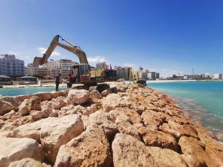 وأضاف سيادته أنه يجرى حالياً تنفيذ المرحلة الثانية من مشروع حماية وتطوير شاطىء خليج مطروح لحماية واجهة ساحلية بطول ٣٠٠ متر بإنشاء رأس حجرية مائلة على خط الشاطىء طولها حوالى ٧٠ متر ثم امتدادها من جهة البحر بشكل موازى للشاطئ تقريباً بطول حوالى ٤٠ متر .