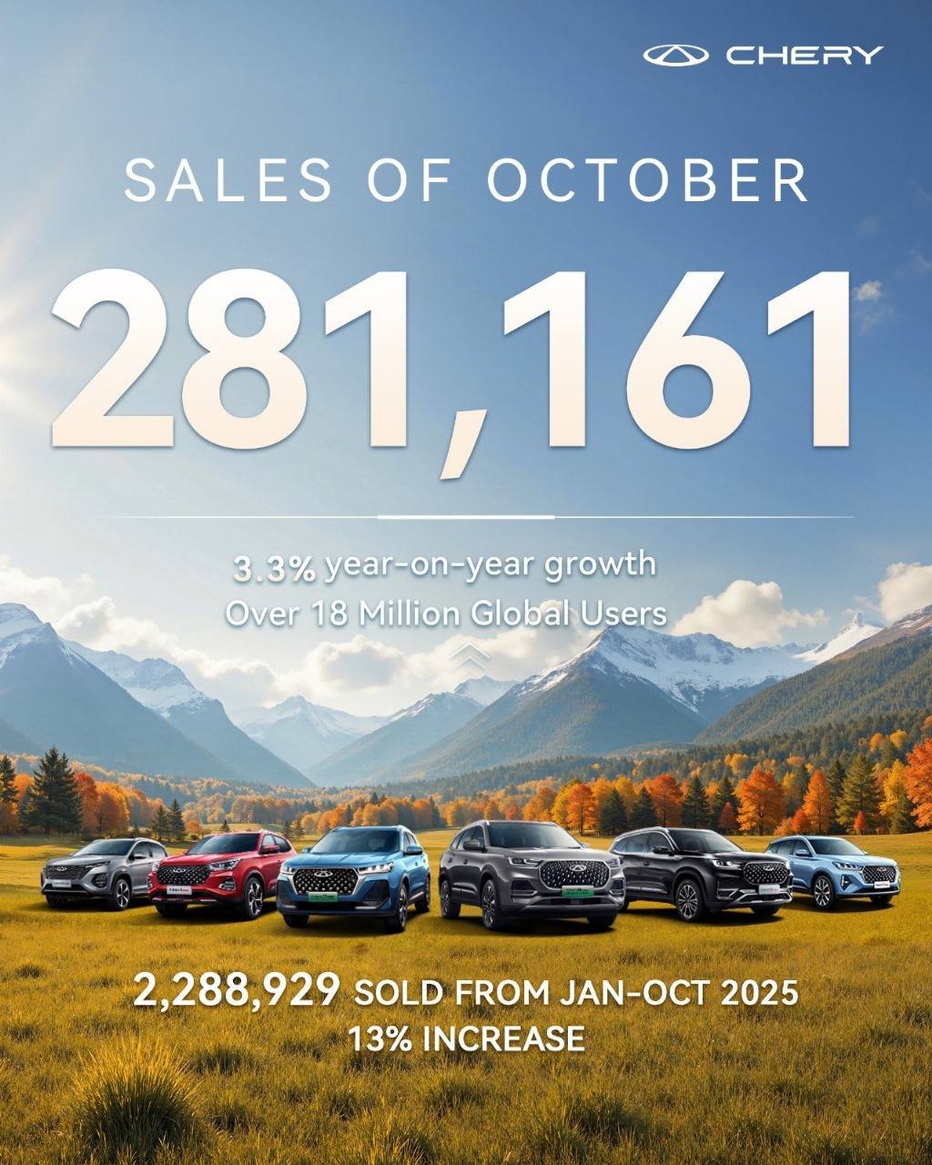 سجلت مجموعة شيري مبيعات بلغت 281,161 سيارة خلال شهر أكتوبر، محققة نمواً سنوياً بنسبة 3.3%. وقفزت مبيعات سيارات الطاقة الجديدة (NEVs) لتصل إلى 110,346 وحدة، بارتفاع 54.7% مقارنة بالفترة نفسها من العام الماضي، وهي المرة الأولى التي تتجاوز فيها مبيعات شيري الشهرية من هذه الفئة حاجز 110 آلاف سيارة.