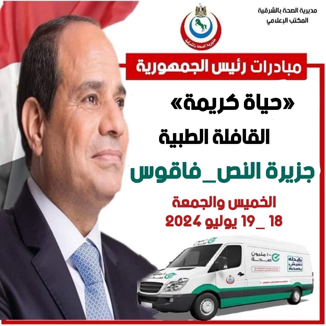 وقال المحاسب محمود عبد الفتاح المتحدث الرسمى عن مديرية الشؤون الصحية بمحافظة الشرقية ان القافلة تعمل لمدة يومي الخميس والجمعة ١٨ – ١٩ يوليو ٢٠٢٤ وذلك ضمن جملة المبادرات الرئاسية والتى منها حياة كريمة والتى تعتنى بالمواطن والبيئة المحيطة به من كافة الخدمات .
