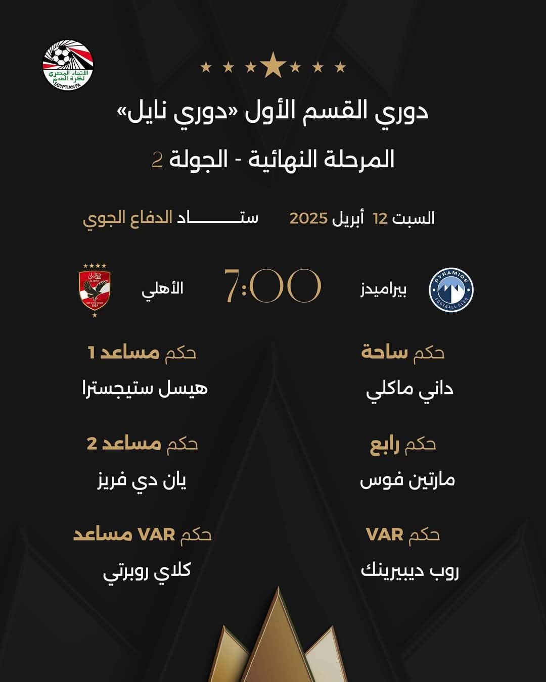 أعلن الاتحاد المصري لكرة القدم إسناد إدارة مباراة بيراميدز والأهلي، ضمن منافسات الجولة الثانية، في المجموعة الأولى بدوري القسم الأول، لطاقم حكام هولندي بقيادة داني ماكلي.