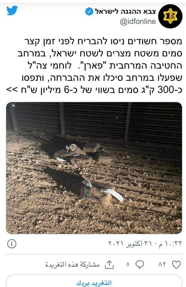 وقال الجيش الإسرائيلي على حسابه عبر "تويتر" إن "عددا من المشتبه بهم حاولوا مؤخرا تهريب مخدرات من الأراضي المصرية إلى الأراضي الإسرائيلية في منطقة لواء باران الإقليمي".