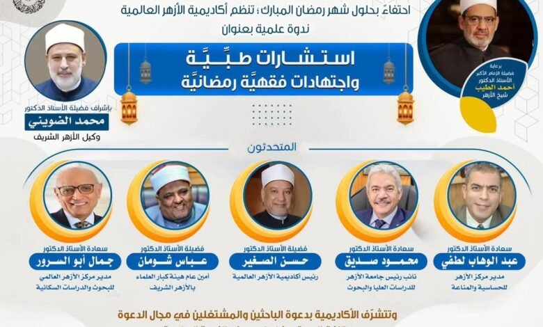 غدا.. أكاديمية الأزهر العالمية لتدريب الأئمة والوعاظ تنظم ندوة علمية بعنوان : “استشارات طبية واجتهادات فقهية رمضانية”