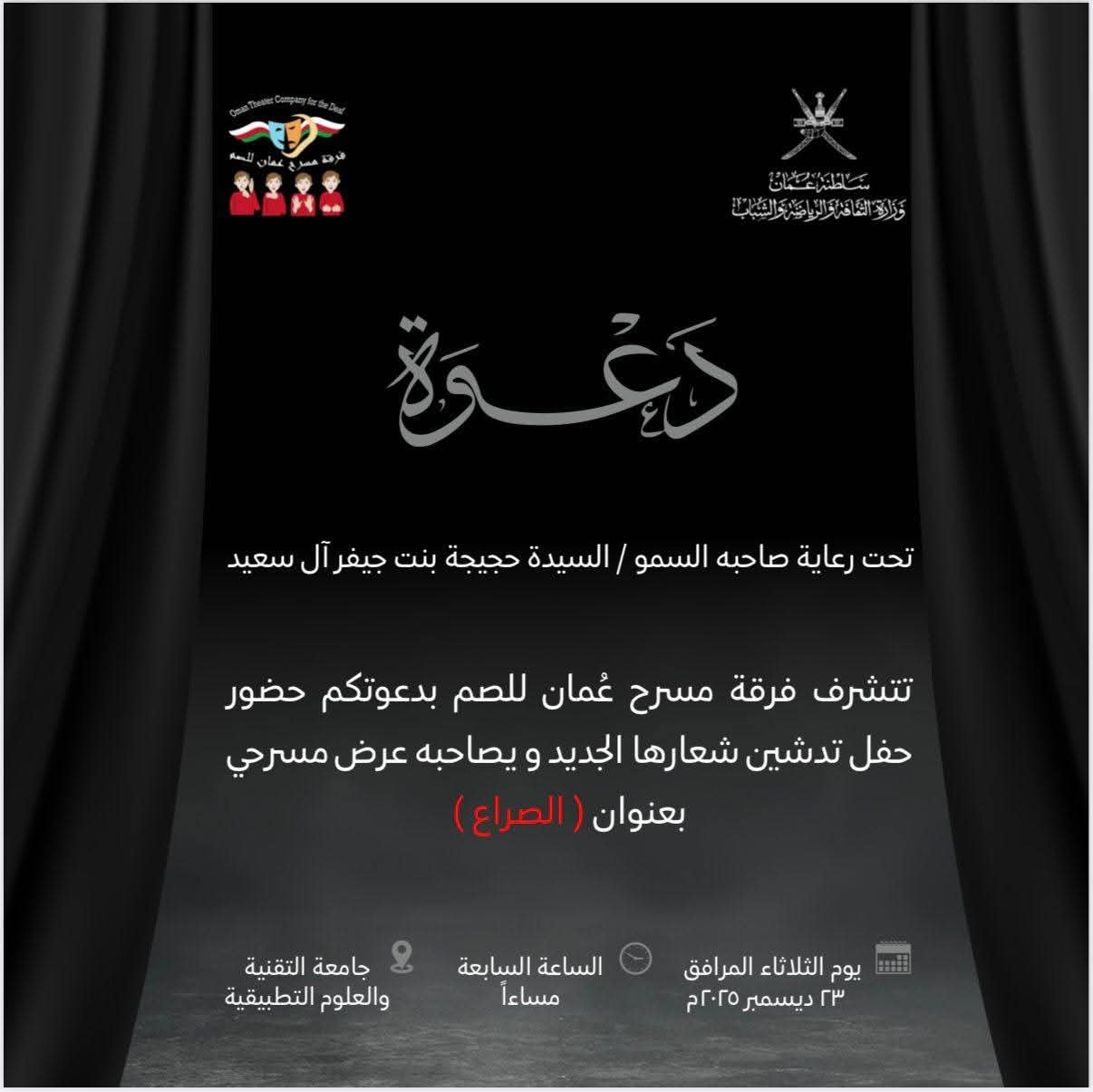 تحت رعاية صاحبة السمو السيدة حجيجة بنت جعفر آل سعيد، تحتفي فرقة مسرح عُمان للصم مساء يوم الثلاثاء الموافق 23 ديسمبر 2025م، في تمام الساعة السابعة مساءً، على مسرح جامعة التقنية والعلوم التطبيقية، بتدشين شعارها الجديد، في أمسية ثقافية مسرحية تتوّج بتقديم عرضها المسرحي المعنون «الصراع».