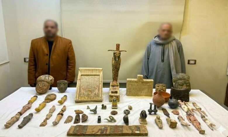 عقب تقنين الإجراءات تم إستهدافهما وأمكن ضبطهما.. وبحوزتهما عدد (53 قطعة أثرية متنوعة).. وبمواجهتهما إعترفا بأن القطع الأثرية المضبوطة نتاج أعمال الحفر والتنقيب عن الآثار بإحدى المناطق بدائرة قسم شرطة القوصية بأسيوط وحيازتهما لها بقصد الإتجار فيها.. وبعرض المضبوطات على مفتشى الآثار تبين أن جميع المضبوطات أثرية وتعود لعصر الدولة المصرية القديمة.