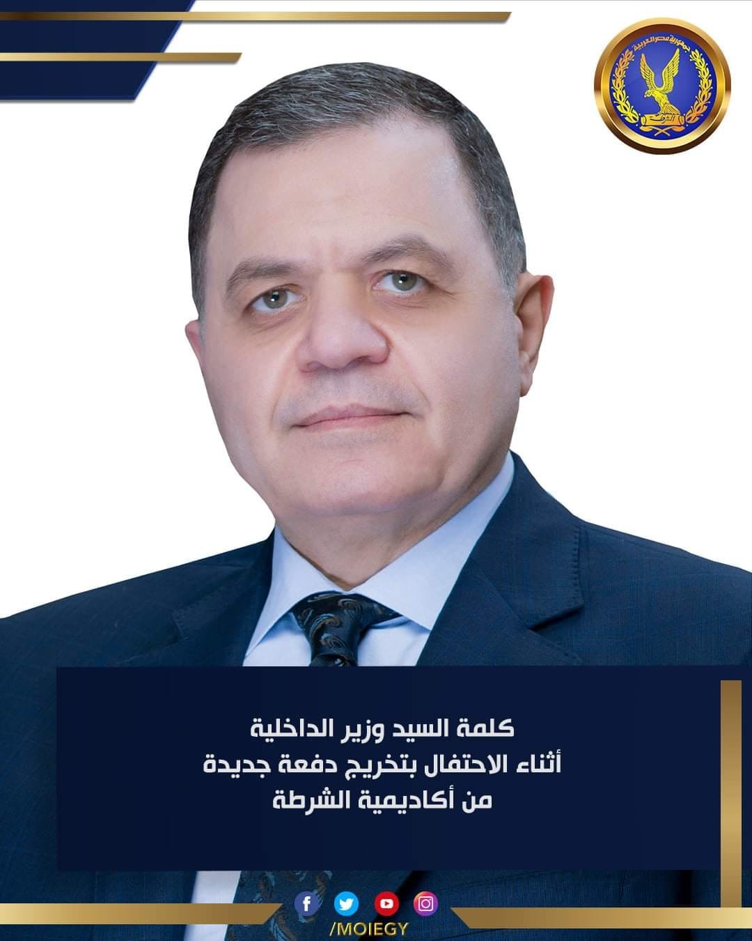 -إن الوزارة لعلى يقين .. أنكم تدركون مسئوليتكم الوطنية وتؤمنون بأن واجبكم المقدس هو حماية هذا الوطن والتفانى فى الحفاظ على مقدراته وإنجازاته وأنكم إلتحقتم بهذا الصرح العريق لتحملوا رسالة أمن الوطن إمتداداً لأجيال بذلوا العطاء لحماية أمنه وإستقراره عليكم أن تحرصوا على مواصلة الإرتقاء بقدراتكم العلمية والبدنية للوفاء بمتطلبات الأداء الأمنى فى إطار الإلتزام التام بالقانون ومبادىء حقوق الإنسان.