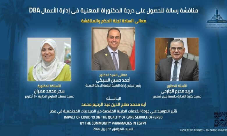 كلية التجارة بجامعة عين شمس تناقش رسالة دكتوراه حول “تأثير كوفيد-19 على جودة خدمات الصيدليات المجتمعية”