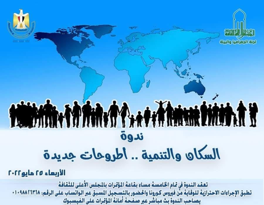 تحت رعاية الدكتورة إيناس عبد الدايم وزيرة الثقافة، ينظم المجلس الأعلى للثقافة بأمانة الدكتور هشام عزمي، ندوة بعنوان السكان والتنمية.. اطروحات جديدة؛ والتي تنظمها لجنة الجغرافيا والبيئة ومقررها الدكتور عبد المسيح سمعان، وذلك في تمام الخامسة مساء الأربعاء الموافق 25 مايو الحالى بقاعة المؤتمرات بالمجلس الأعلى للثقافة.