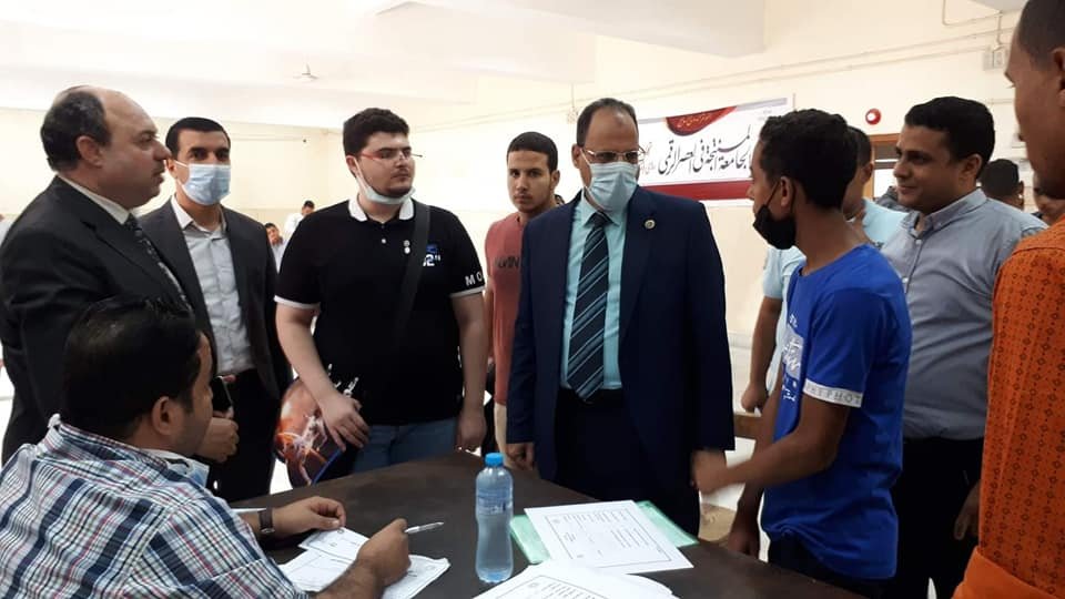كما قام الدكتور/ رمضان فرحات والدكتور/ محمدعبدالحليم والدكتور /محمد حسين بالرد على جميع الاستفسارات التي تدور في أذهان الطلبة وتزويدهم بالمعلومات الإرشادية والخطوات المتابعة لإنهاء إجراءات الالتحاق بالكلية