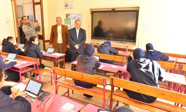 واستهل المحافظ جولته بتفقد لجان امتحانات مدرسة الشهيد أحمد فايز الثانوية بنات، حيث تابع لجان الصف الثاني الثانوي (نظامي، منازل، خدمات)، واطمأن على سير الامتحان في مادة الرياضيات، التي يؤديها طلاب النظامي باستخدام أجهزة التابلت، بينما يؤديها طلاب المنازل والخدمات ورقيًا، كما استمع إلى آراء الطالبات حول مستوى الامتحان ووضوح الأسئلة، وتأكد من عدم وجود أية معوقات فنية أثناء أداء الامتحانات الإلكترونية.