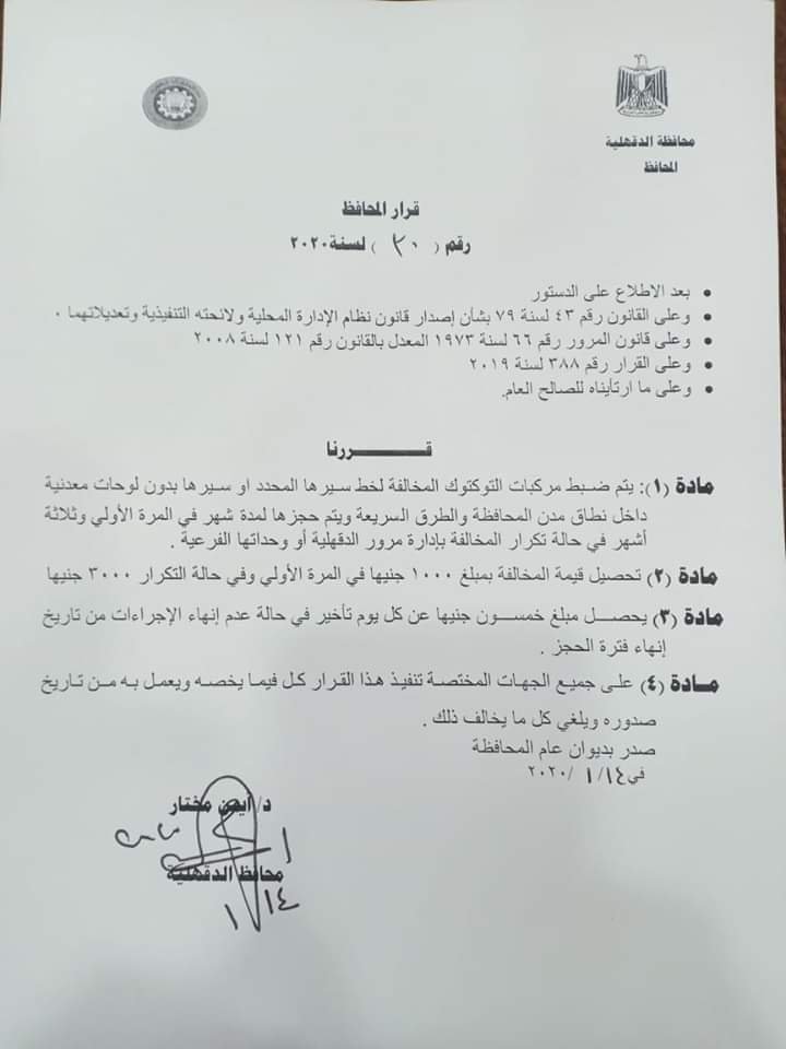 وأوضح محافظ الدقهلية أن هذا القرار يأتي في إطار المسئولية الاجتماعية للدولة وحرصا على مصالح المواطنين ولتحفيز أصحاب التكاتك على استبدالها بالسيارة "فان" 7 راكب.