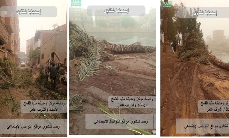 استجابت الاجهزة التنفيذية محافظة الشرقية سريعا لما تم تداوله ورصده عبر منصات التواصل الإجتماعي وأثناء المتابعات الميدانية ، بشأن سقوط عدد من الأشجار وأعمدة الإنارة وذلك نتيجة نشاط في سرعة الرياح والأتربة وسقوط الأمطار خلال موجة التقلبات الجوية المفاجئة التي تعرضت لها من سور الاحوال الجوية قامت الأجهزة التنفيذية بمركز ومدينة منيا القمح برفع وإزالة النخلة المتساقطة بشارع عابدين بنطاق الوحدة المحلية بالعزيزية ، وفي شارع هندسة الري بجوار مستودع الأنابيب تم رفع شجرة ومخلفاتها من الشارع ، فضلاً عن إستعدال 2 عمود إنارة ، واستبدال وزراعة أخر جديد بدلاً من العمود المتساقط