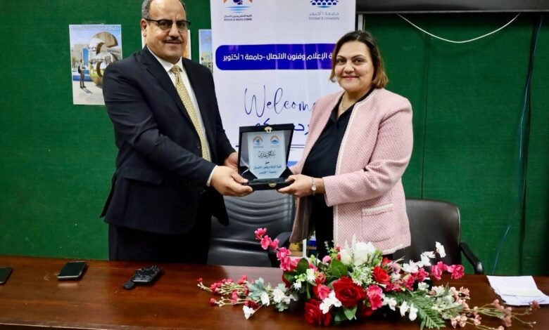 تحت رعاية الأستاذ الدكتور ممدوح مصطفى غراب رئيس جامعة 6 أكتوبر والأستاذ الدكتور هشام تمراز نائب رئيس الجامعة لشئون خدمة المجتمع وتنمية البيئة وتحت إشراف وبحضور الأستاذة الدكتورة دينا فاروق أبوزيد عميد كلية الإعلام وفنون الاتصال، نظمت اليوم الكلية ندوة بعنوان المجلة الصحفية من الفكرة إلى النشر ، حاضر فيها الكاتب الصحفى أستاذ محمد أمين رئيس تحرير مجلة أكتوبر وعضو المجلس المصرى للشئون الخارجية، واستقبله ورحب به الأستاذ الدكتور ممدوح مصطفي غراب رئيس الجامعة.
