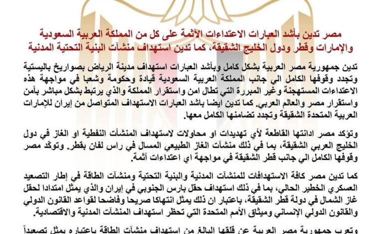 مصر تؤكد إدانتها الكاملة لاستهداف مدينة الرياض بصواريخ باليستية وتجدد وقوفها الكامل إلى جانب المملكة قيادة وحكومة وشعبًا معتبرة هذه الاعتداءات تهديدًا مباشرًا لأمن المنطقة بما في ذلك أمن مصر كما دانت بشدة الاستهداف المستمر للإمارات وجددت تضامنها الكامل معها مؤكدة دعمها الكامل لقطر في حماية منشآتها النفطية والغازية بما فيها حقل راس لفان
