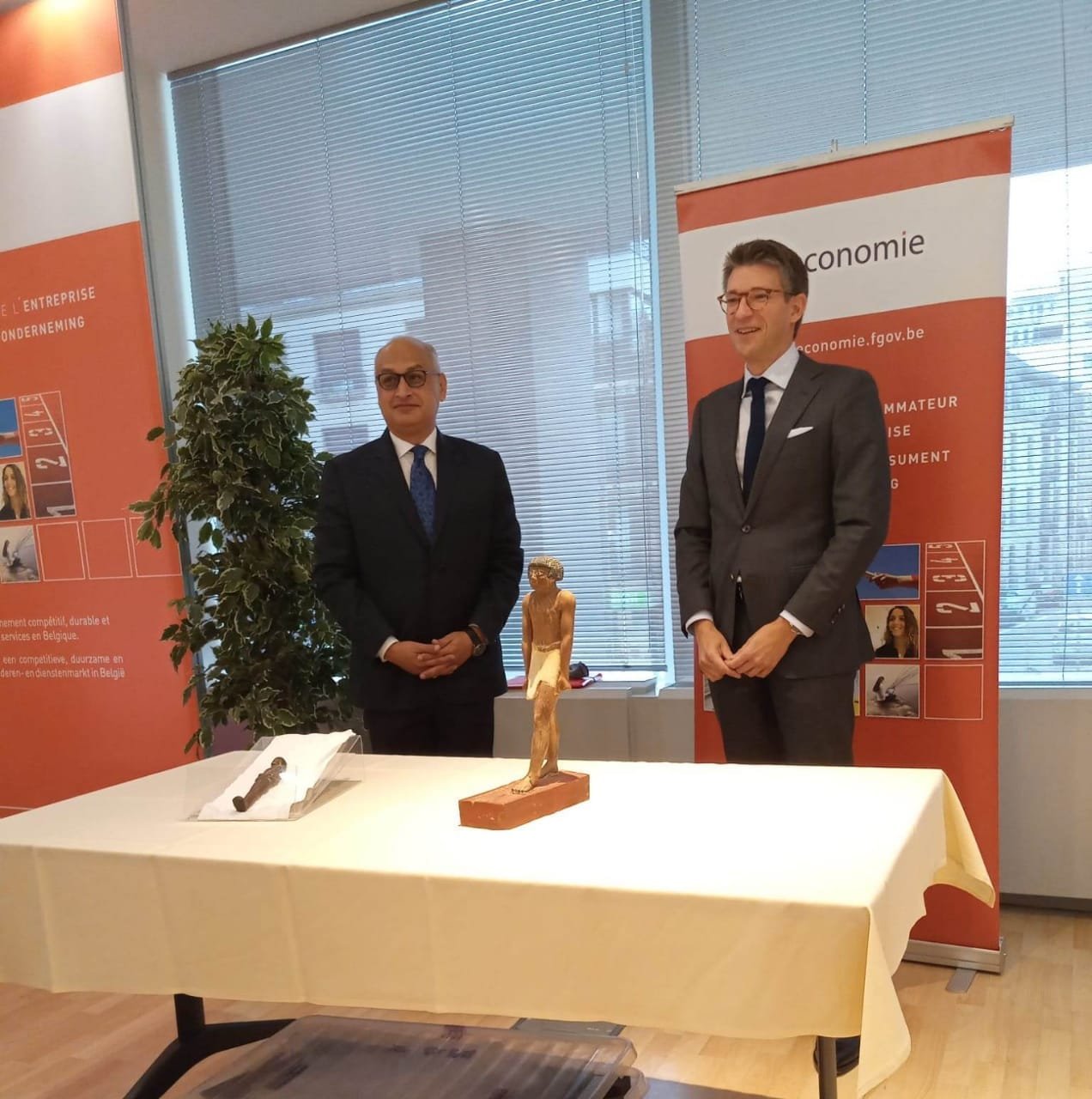 في إطار جهود مصر الحثيثة لاستعادة الآثار المصرية المهربة بالخارج وما توليه الدولة المصرية ومؤسساتها من اهتمام بالغ للحفاظ على تراثها وتاريخها الحضاري، والدور الذي تضطلع به وزارة الخارجية بالتعاون مع وزارة السياحة والآثار ومكتب النائب العام في مجال استعادة الآثار المصرية المهربة، واستمرارا للجهود المتواصلة التي تقوم بها السفارة المصرية في بروكسل مع دور العرض والسلطات البلجيكية المختصة لاسترداد القطع الأثرية المصرية التي خرجت من البلاد بطريقة غير شرعية؛ فقد تسلم السفير خالد البقلي سفير جمهورية مصر العربية لدى مملكة بلجيكا ولدى المجلس الأوروبي والمفوضية الأوروبية قطعتين أثريتين مصريتين تم إخراجهما من مصر بصورة غير شرعية؛ وتتمثلان في تمثال من الحجر الجيري الملون لرجل واقف يرتكز على قاعدة يعود للحضارة المصرية القديمة عصر الدولة القديمة، وتمثال آخر صغير من "الأوشابتي" المصنوع من مادة الفيانس يعود للحضارة المصرية القديمة في عصرها المتأخر.