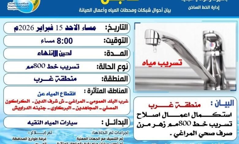 وأوضحت الشركة أن أعمال الإصلاح تتطلب قطع المياه عن بعض المناطق، وهي: غرب البلد العمومي، المراغي، شارع شرف الدين، الكراكون، المصلي، المجاهدين، البركاوي، وجنينة الدرويش، وذلك اعتبارًا من الساعة الثامنة مساء اليوم الأحد الموافق 15 فبراير 2026م وحتى الانتهاء من الإصلاح.